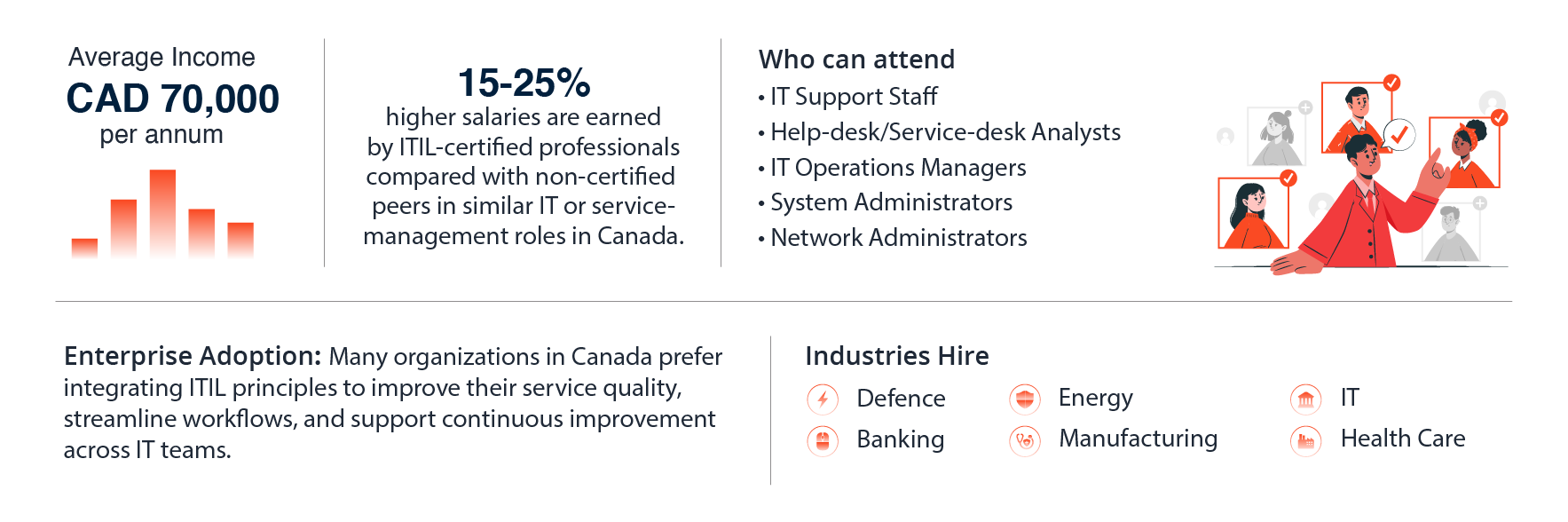 The ITIL 4 Foundation training helps professionals qualify for IT support, coordination, and service management roles that are in demand across Canada's technology and service sectors.
