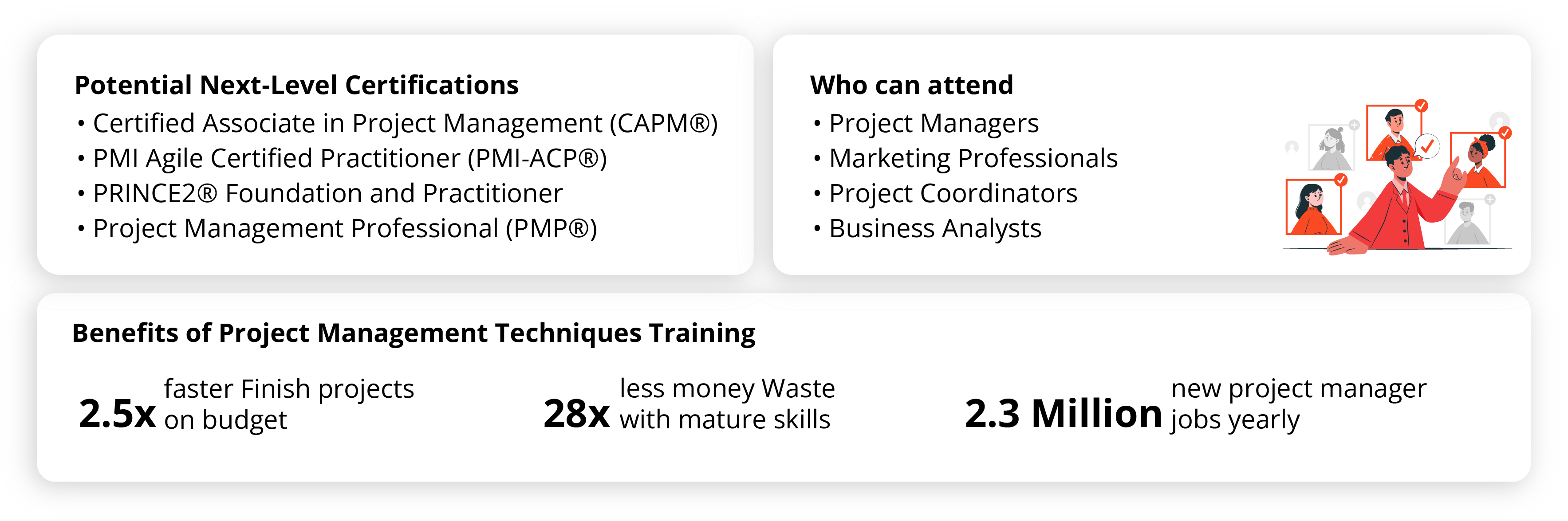 Project Management Techniques Training makes professionals with essential tools and methodologies. Here are some learnings listed: