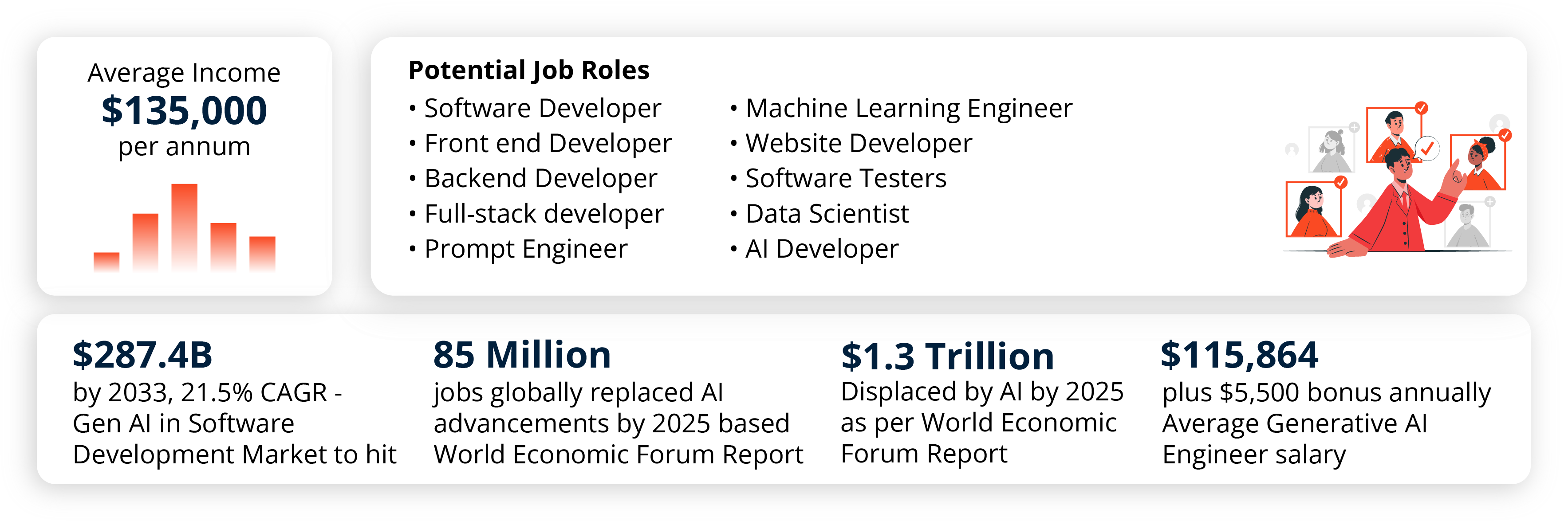 Simpliaxis's Generative AI for Software Developers Learning Path, crafted by industry experts, empowers frontend, backend, and full-stack developers to excel in Prompt Engineering, Software Testing, and harnessing Large Language Models (LLMs) for code generation and optimization. This comprehensive course delves into Gen AI tools, types, principles, and more, equipping you to thrive in a field with a projected 20% job growth by 2028.