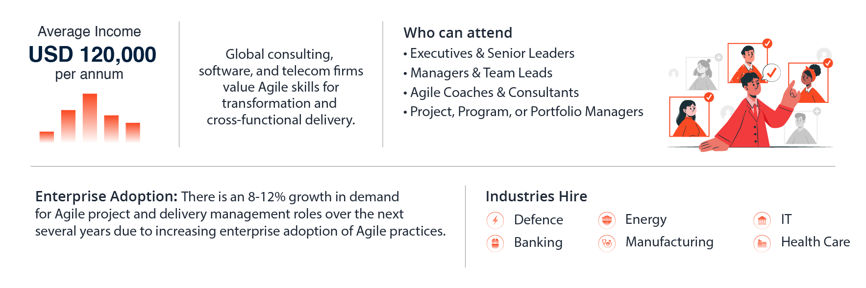 Apply Agile Skills Across Industries: Certified individuals can apply Agile project and delivery management principles across technology, operations, and business functions.