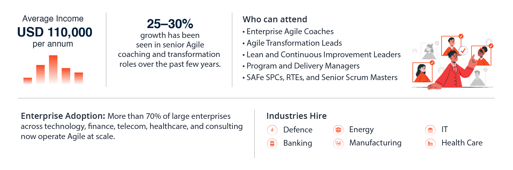 Career Growth into Strategic Agile Roles: Certified professionals get the best way to position themselves for senior roles, such as Enterprise Agile Coach or Transformation Lead, within large organizations.