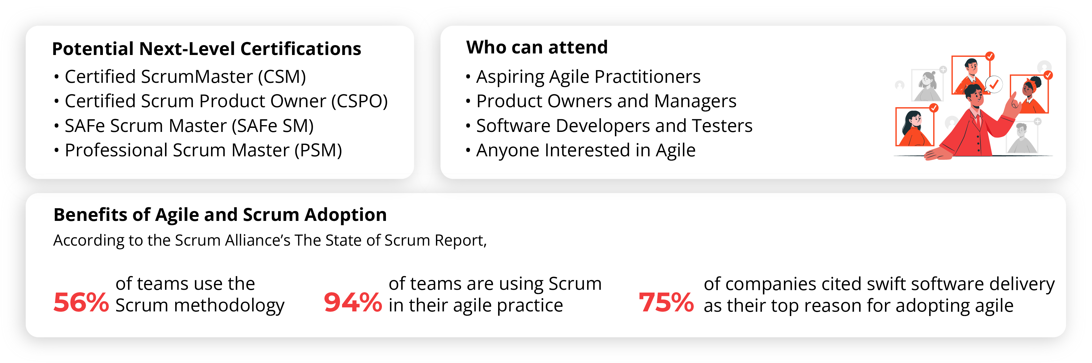 This foundational course, led by Certified Scrum Trainers, helps professionals align conventional project management with the Agile route. It is ideal for newbies who aspire to become project managers, scrum masters, product owners, and team members involved in Agile and Scrum development. The certification equips professionals with skills to effectively implement the Scrum framework and Scrum values, improving project success rates and career prospects. In fact, Scrum Masters report an average salary increase of 25% after certification.