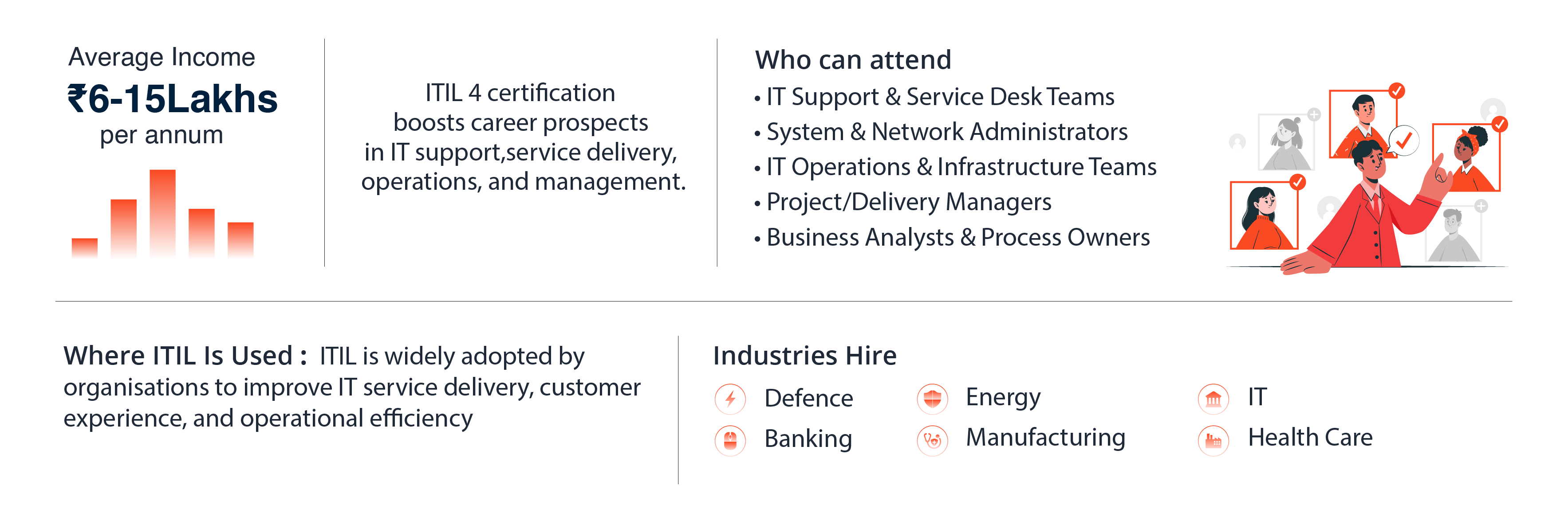 Earning the ITIL 4 Foundation brings new opportunities across IT operations, service management and support functions—from Incident Manager, Service Desk Analyst and Change Coordinator to IT Service Delivery Lead. Employers value certified professionals who align IT services with business goals and can help optimise processes.