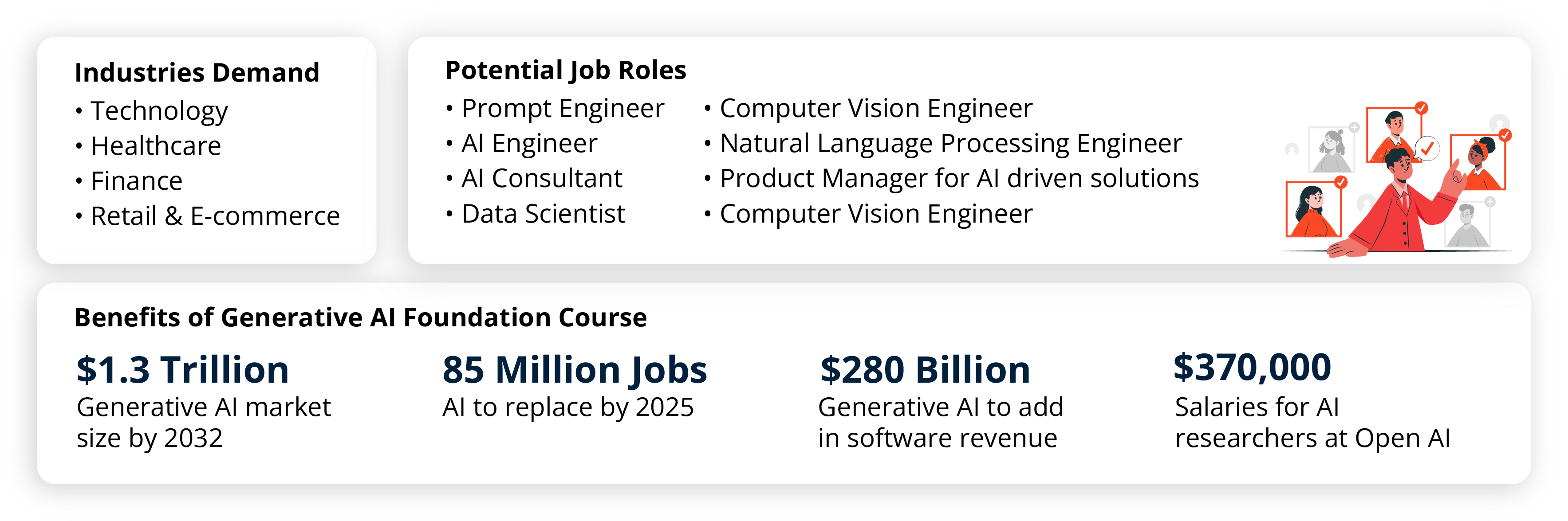 Through Generative AI Fundamental training, Simpliaxis empowers participants to harness the potential of this revolutionary field. Graduates will gain the knowledge and skills to build real-world solutions across various domains. Whether you are an aspiring AI engineer, data scientist, or creative professional, this course makes you contribute to the next wave of technological advancements.