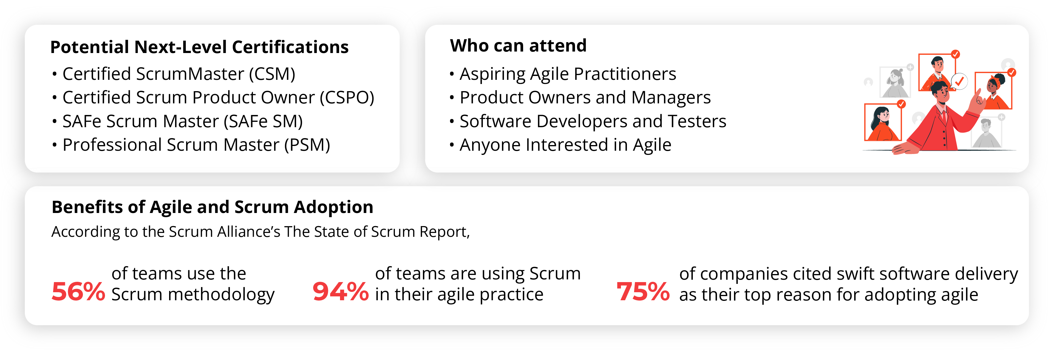 Agile and Scrum certification offer many benefits apart from opening many job opportunities and career path: