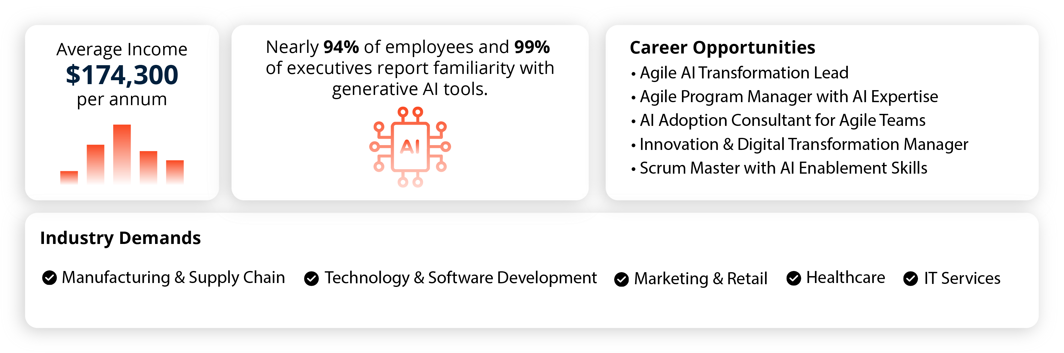 You also comprehend the industry best practices to design user stories, generate acceptance criteria, refine documentation, and model potential results. Our in-depth exercises and immersive sessions make you confident enough to apply generative AI strategically in any Agile environment.