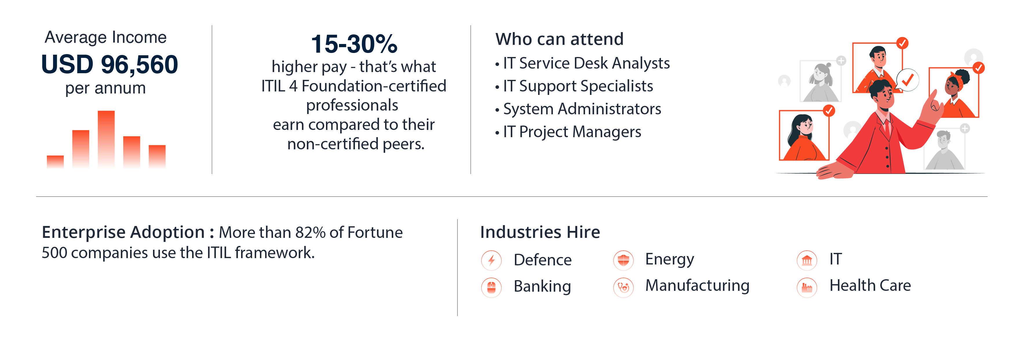 No prior certifications are required for enrolling in the ITIL® 4 Foundation Course in the USA. It is an entry-level qualification and suitable for IT professionals, service desk staff, and managers. Candidates need only a basic understanding of IT operations and service management concepts to start their ITIL 4 learning journey.